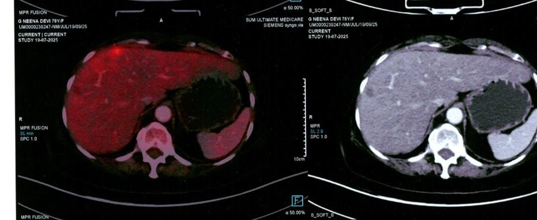Considering her age and the presence of liver metastasis, a sigmoid colon resection with end colostomy was performed in April 2025. After discussion with the medical oncologist, it was planned to proceed with chemotherapy for the liver metastasis. She subsequently received four cycles of chemotherapy under close supervision, which were completed in July 2025. Follow-up PET-CT revealed regression in the size of the liver metastasis, with no new lesions, and no recurrence at the local site or in the peritoneum.